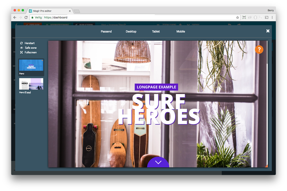 The preview window now opens directly in the scene where you are working on. From the side menu you can jump faster to the specific scene you want to check. The 'safe zone' can be switched on visually and you have more standard screen sizes from the 'top menu' to check your design. With the orange corner at the bottom right of the screen you can scale the window in any specific screen format.